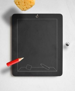 Wer`s lieber praktischer mag, für den gibt es auch noch das EinBrett, das sich am iPad orientiert und eine magnetische Kreidetafel darstellt. Optisch vielleicht nicht ganz so nah am Original aber nicht minder lustig.
