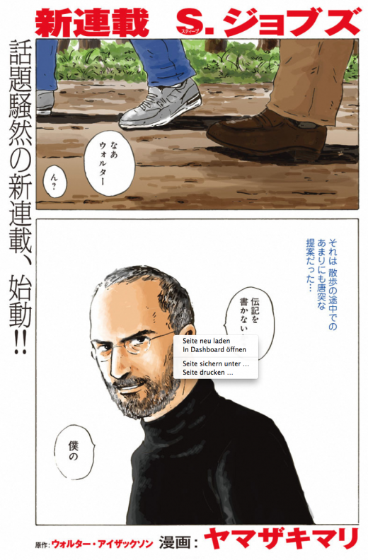 Der japanische Manga Verlag Kodansha veröffentlichte nun erste Bilder von „Steve Jobs“. Das Comic wurde vorerst nur im japanischen Yahoo BookStore veröffentlicht, wird aber ab April im Kiss Magazin in einzelnen Episoden erscheinen.