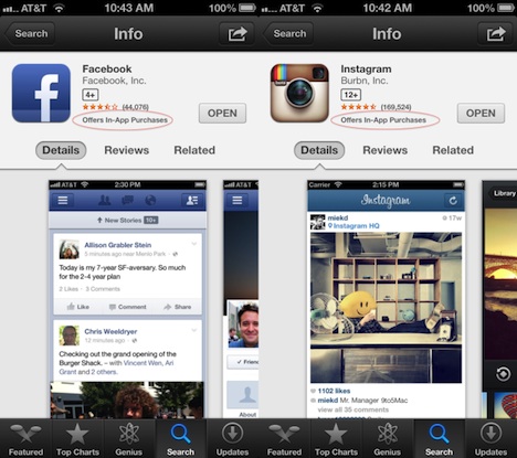 Ein Bug im App Store von Apple sorgt dafür, dass auch Apps, die keine In-App-Käufe anbieten den Hinweis auf „In-App-Käufe“ erhalten. Als Beispiel dafür können Facebook und Instagram genannt werden. Dies trifft zwar nicht auf alle Apps zu, jedoch auf einige, sodass Nutzer unter Umständen getäuscht werden können.