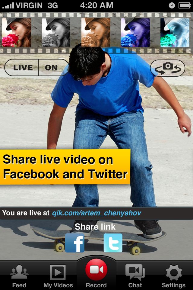 Der Voice over IP Service Qik ist einer der ersten, der die mobilen Plattformen nicht nur einzeln bedient, sondern auch Videotelefonie zwischen den Plattformen ermöglicht: iOS kann ab sofort auch mit Android videotelefonieren. Die Verbindung läuft sowohl über WiFi als auch 3G, neu in Version 6.3 sind außerdem Live-Videoeffekte. Videonachrichten können mit Hilfe der App auch "offline" aufgezeichnet, grundlegend bearbeitet und anschließend per Email verschickt werden.